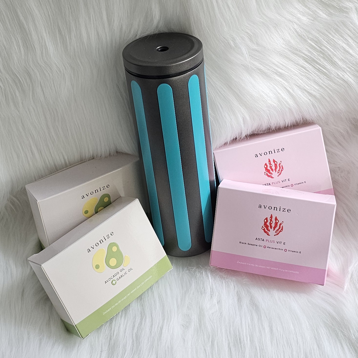 โปรพิเศษ แก้วเก็บความเย็น สีดำ พาดลายเส้นตั้งสีฟ้าเทอร์ควอยส์ + Avonize Avocado Oil Plus Garlic Oil 2 + Avonize Asta Plus Vit E 2