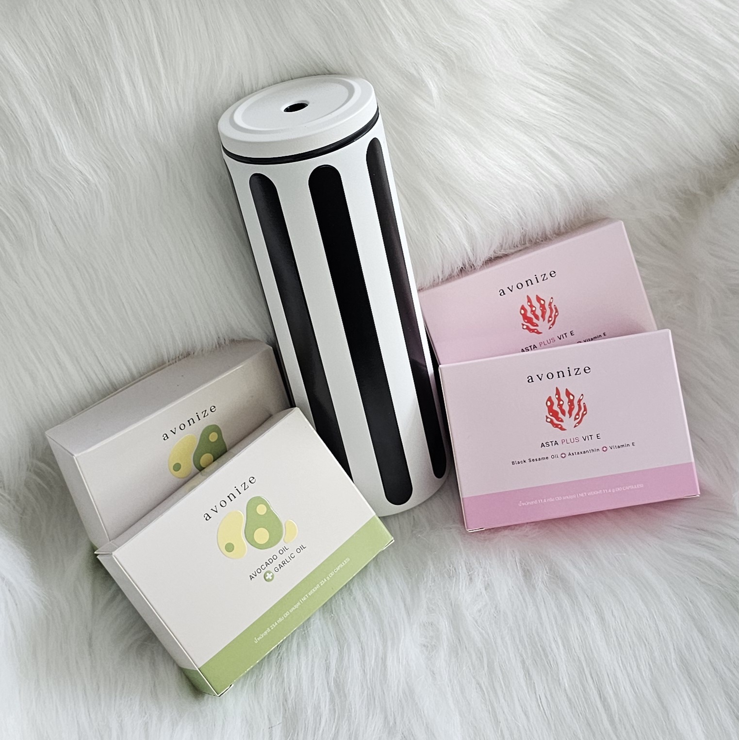 โปรพิเศษ แก้วเก็บความเย็น สีขาว พาดลายเส้นตั้งสีดำ + Avonize Avocado Oil Plus Garlic Oil 2 + Avonize Asta Plus Vit E 2